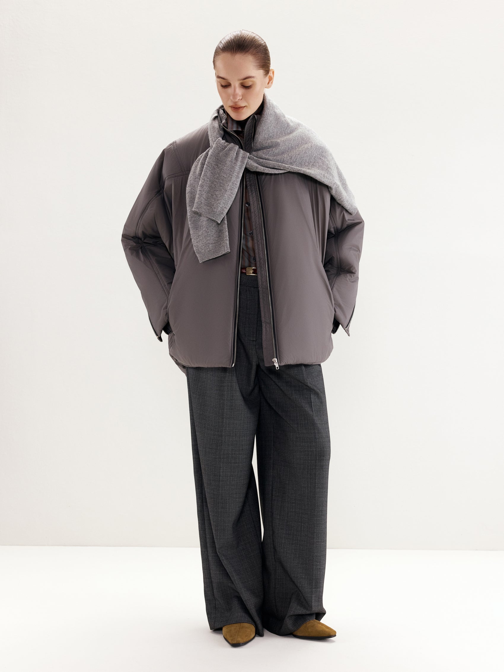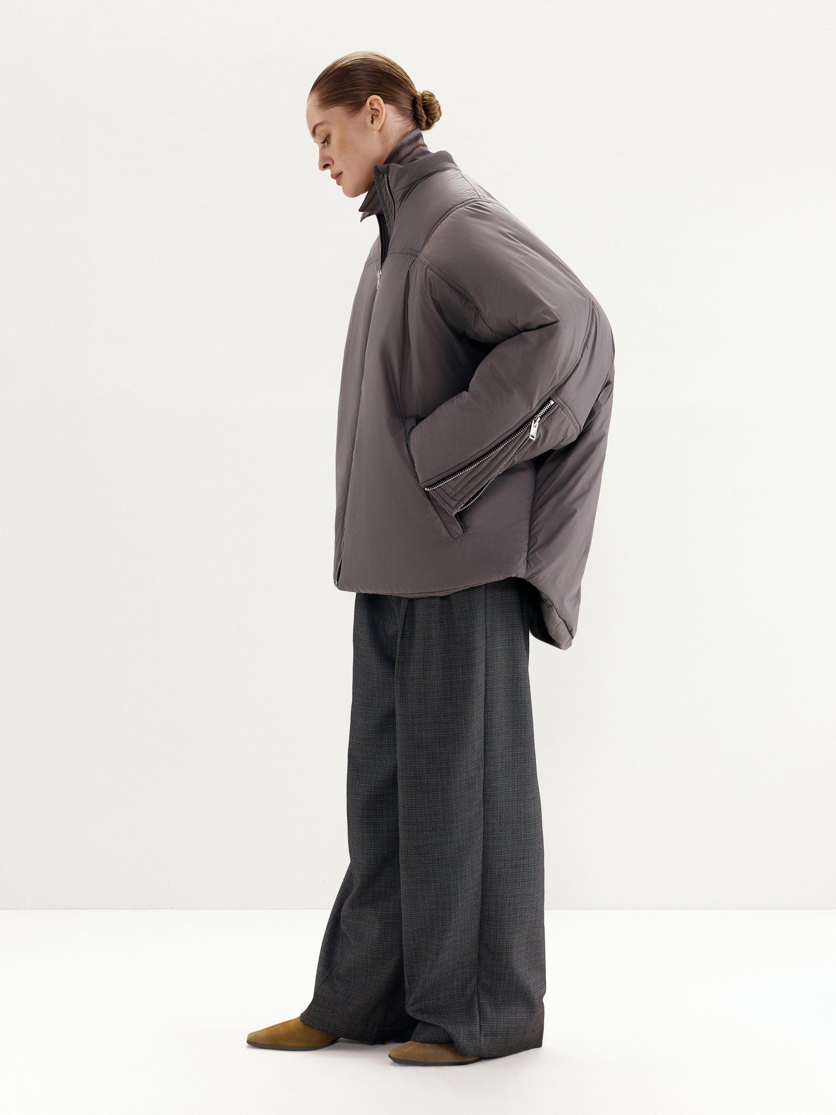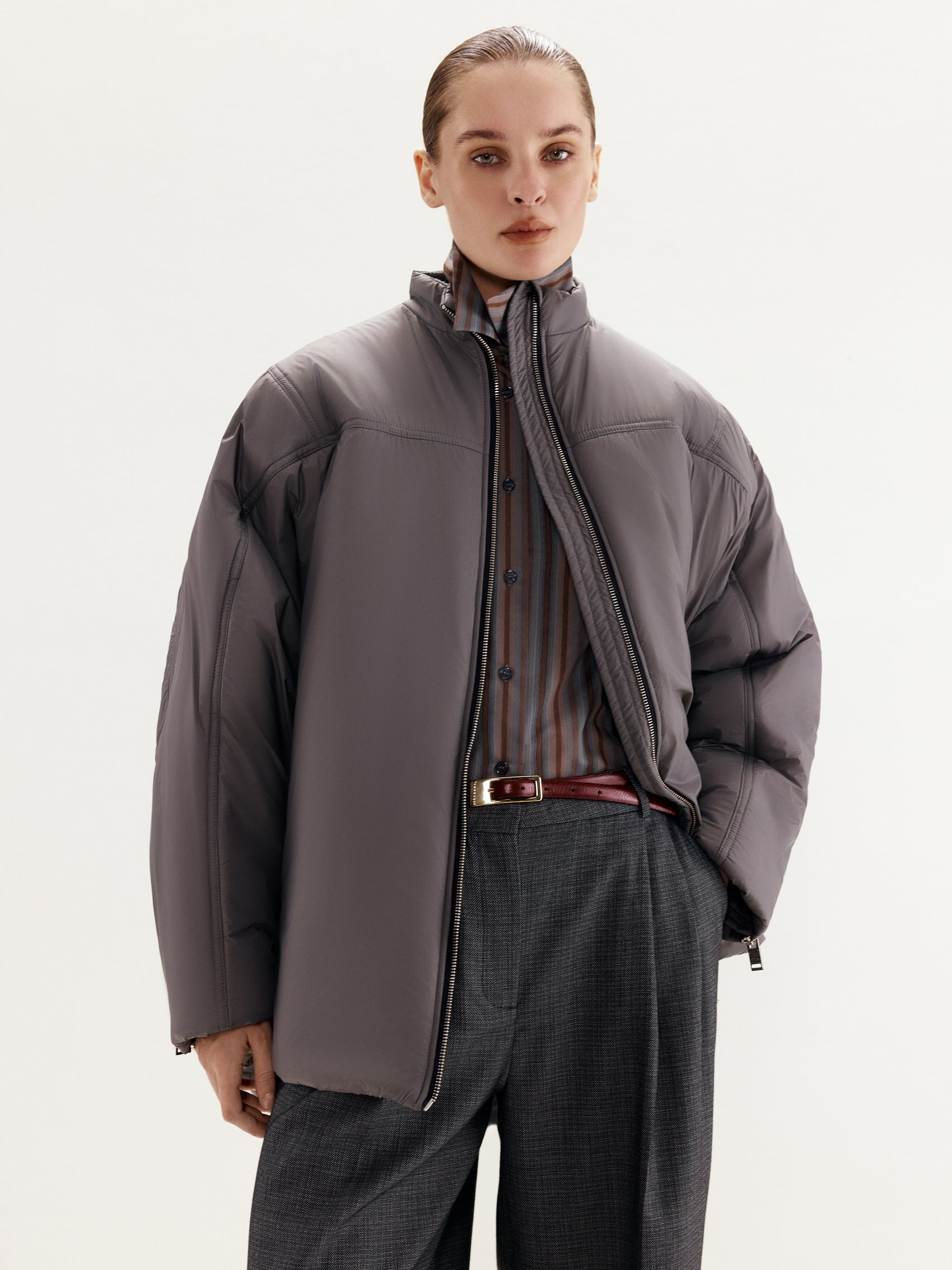 Куртка застібається на молнію спереду, а додаткові молнії на рукавах дають можливість змінювати стиль і вигляд, відкриваючи їх для більш розслабленого образу. Спереду куртка коротша, ніж ззаду, що додає цікавого акценту в дизайні. Горловина виконана у вигляді стійки, що забезпечує додатковий комфорт і тепло.