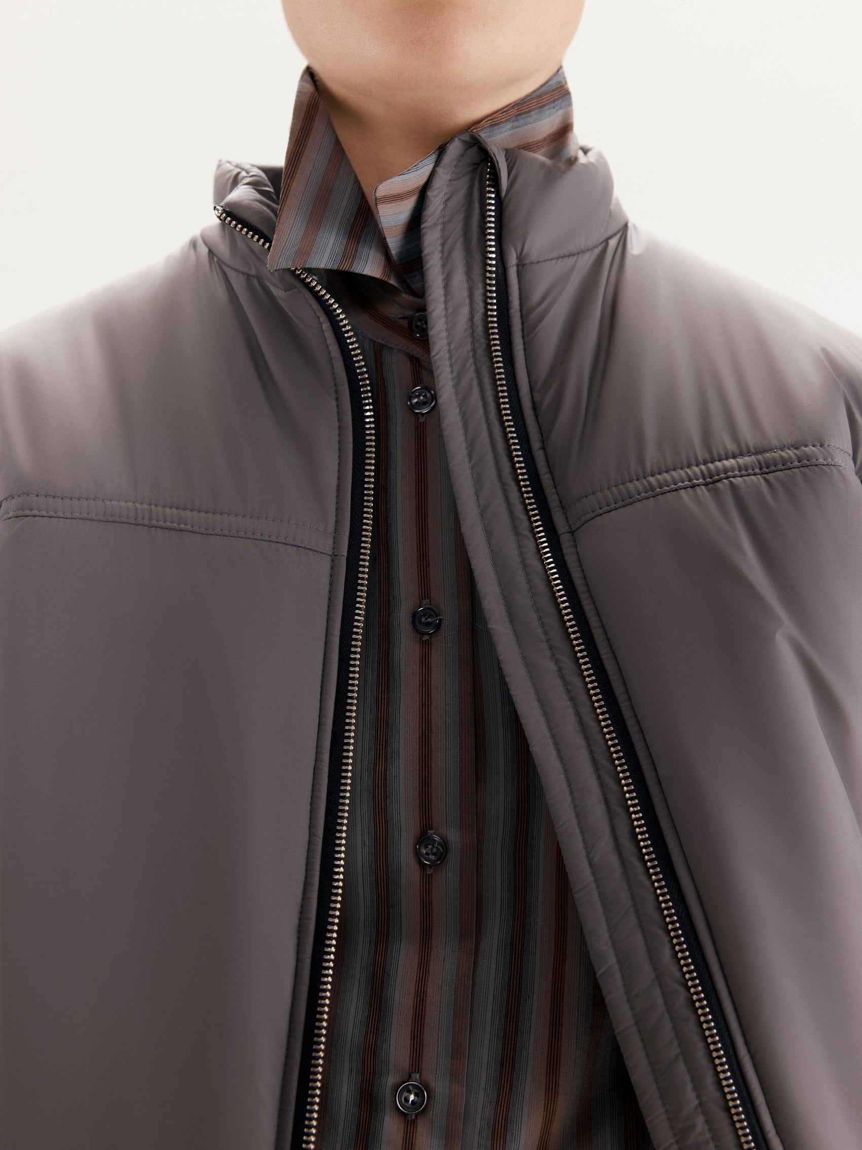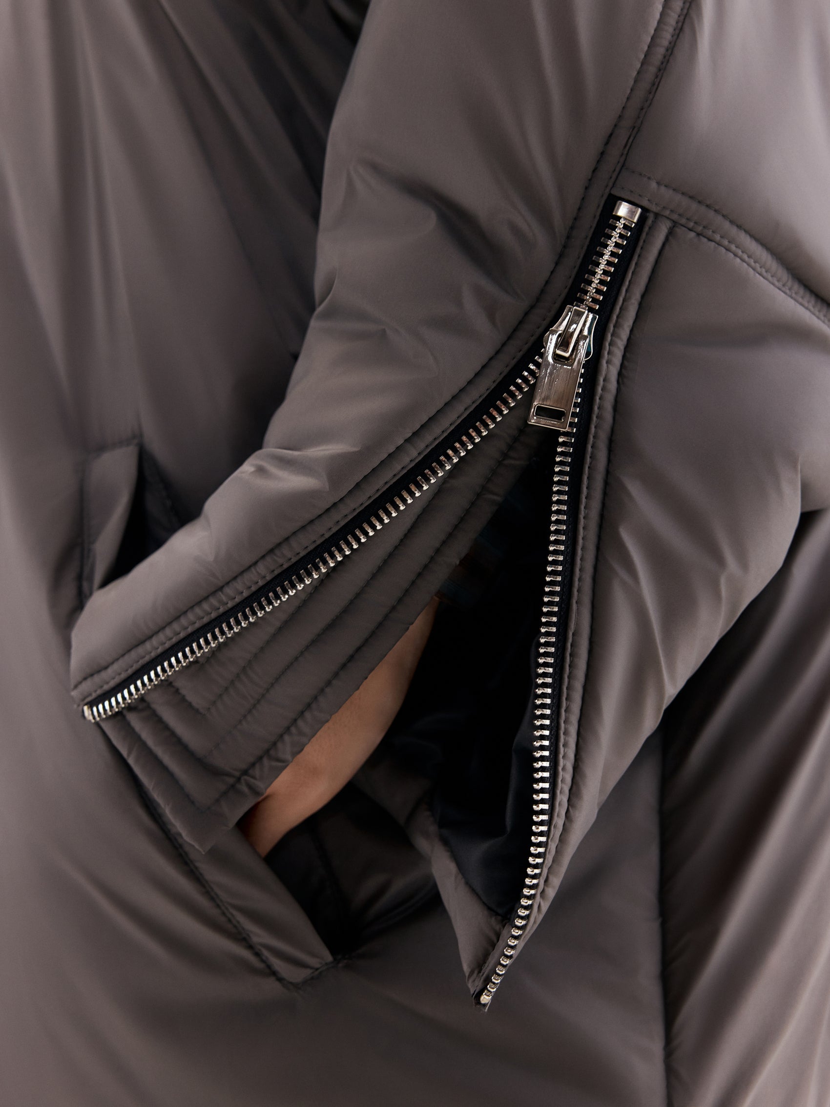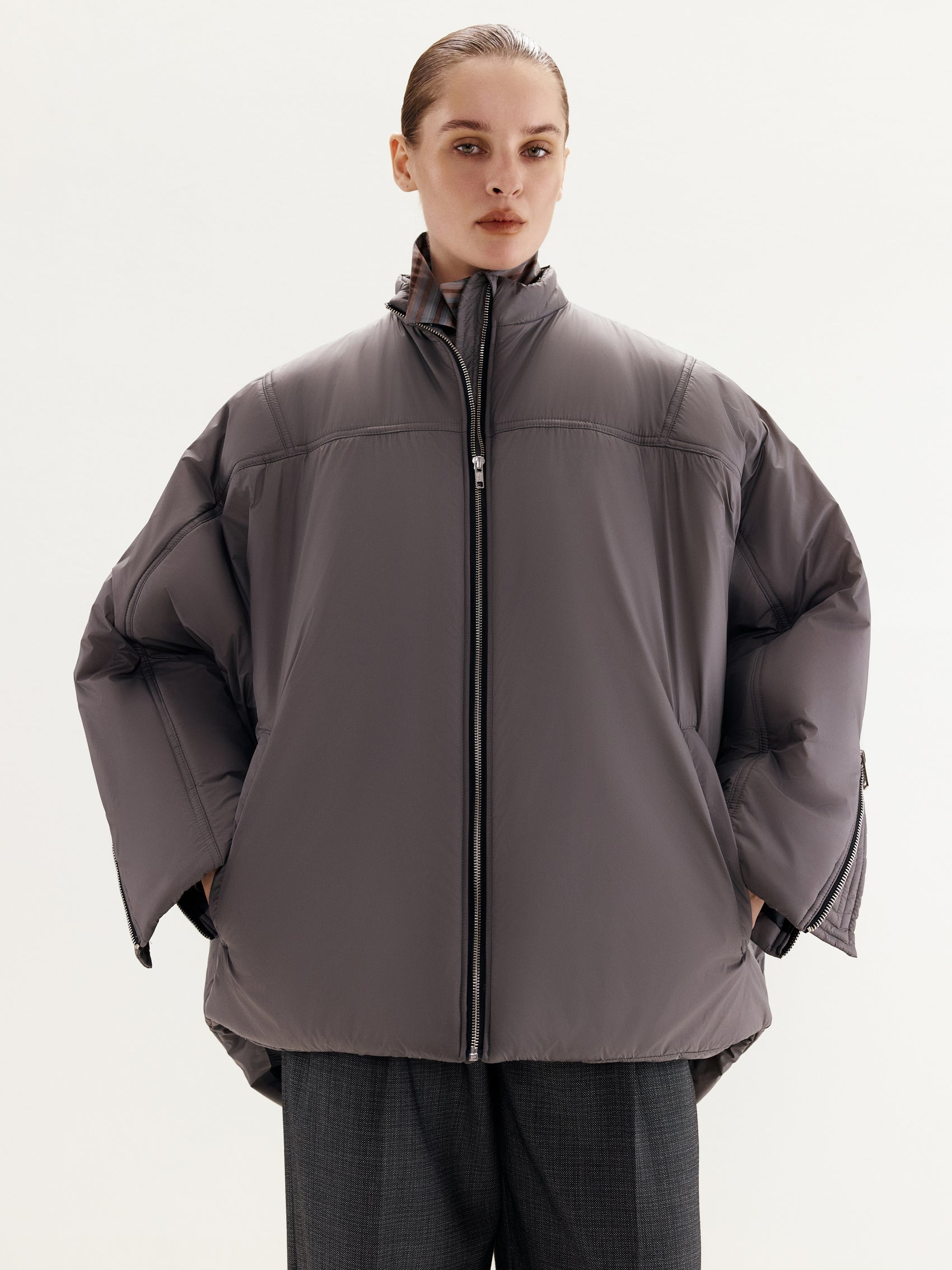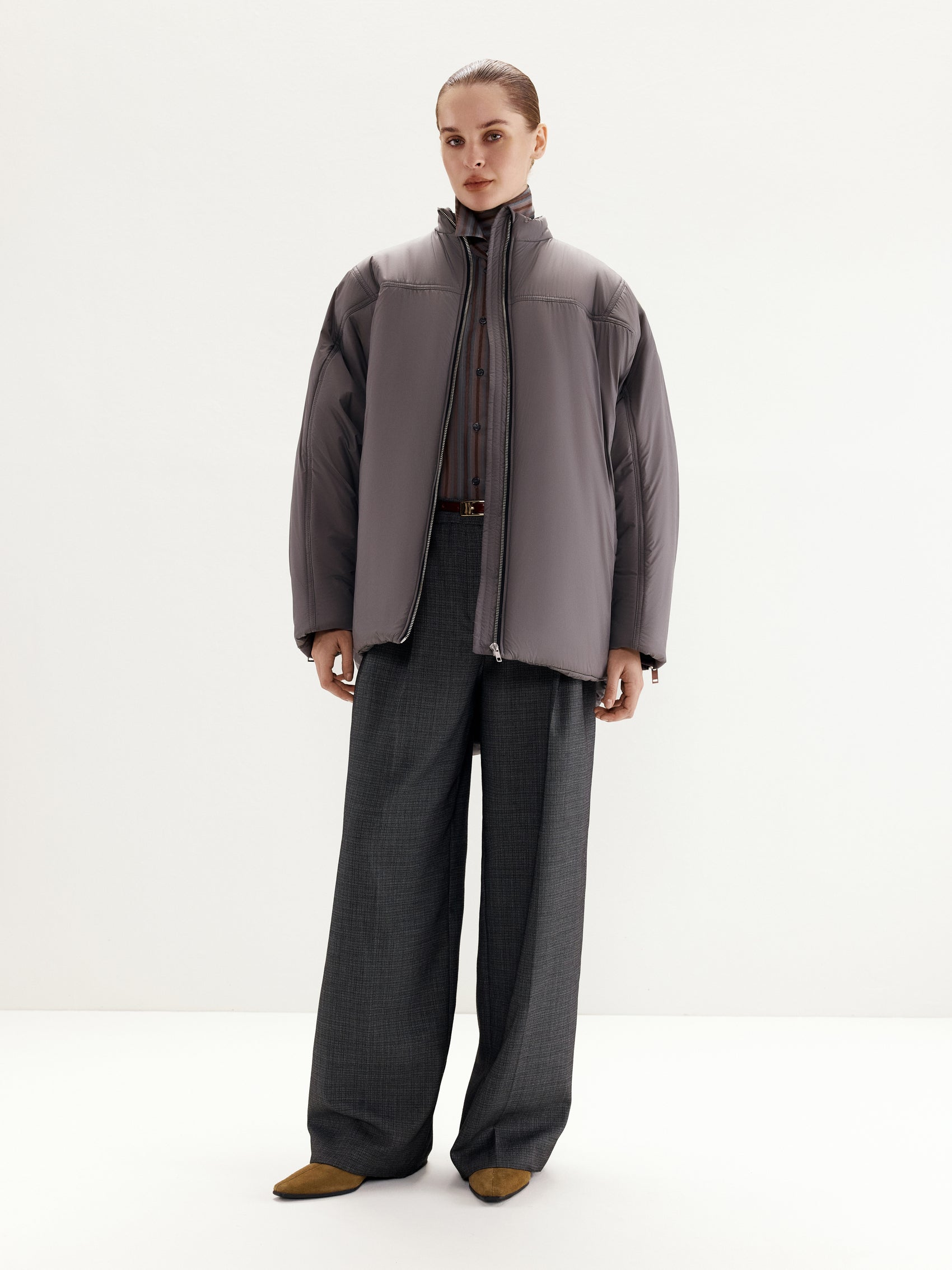 Куртка застібається на молнію спереду, а додаткові молнії на рукавах дають можливість змінювати стиль і вигляд, відкриваючи їх для більш розслабленого образу. Спереду куртка коротша, ніж ззаду, що додає цікавого акценту в дизайні. Горловина виконана у вигляді стійки, що забезпечує додатковий комфорт і тепло.